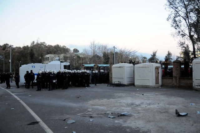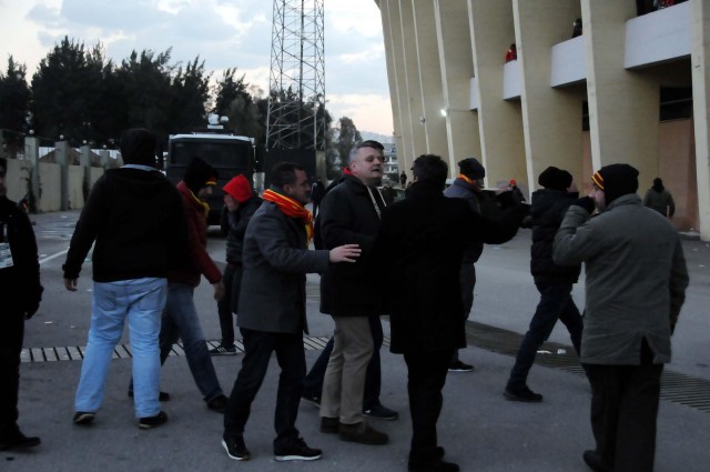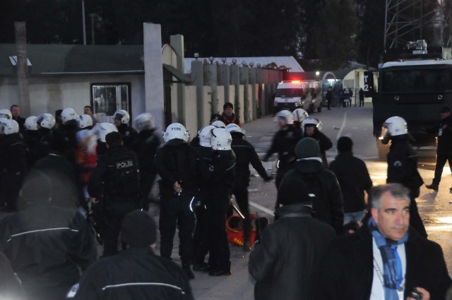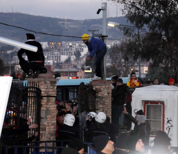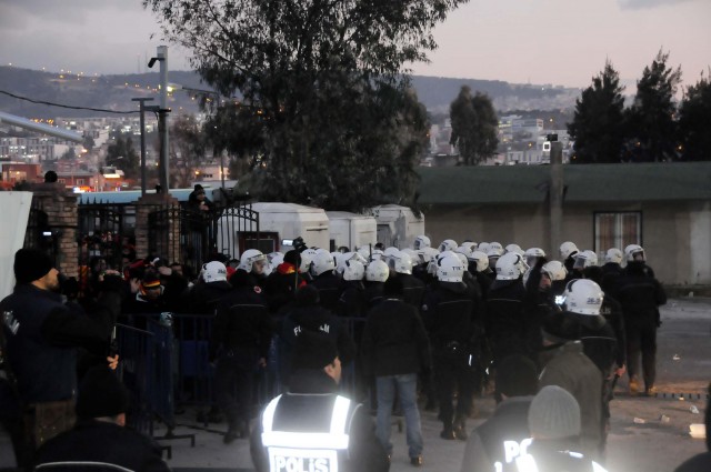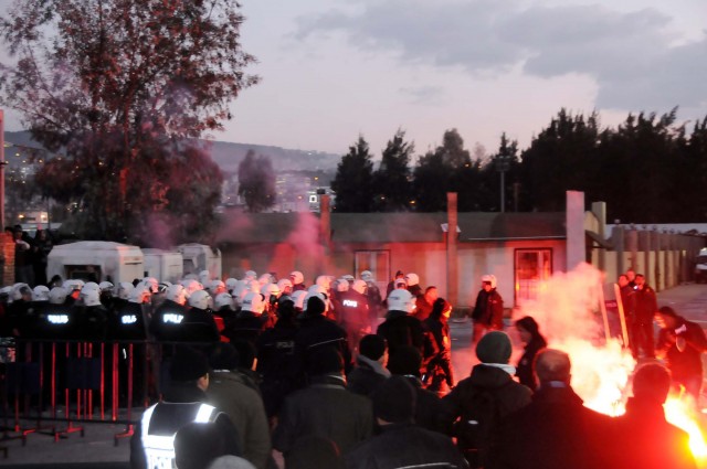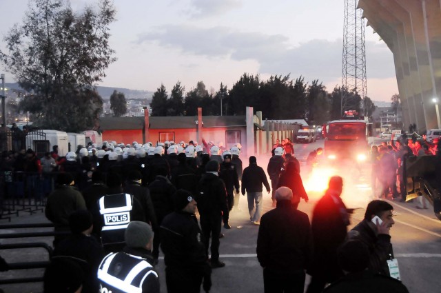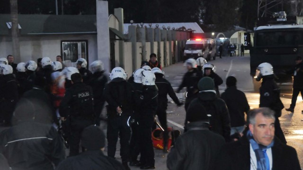 İZMİR Atatürk Stadı'nda saat 19.00'da başlayacak Altay-Göztepe derbisi öncesi açık tribünün girişinde olaylar çıktı. 5'er kişilik gruplar halinde stada alınan Göztepeli taraftarların bir anda kapıya yığılmasıyla arbede olurken, güvenlik güçleri futbolseverlere biber gazı ve tazyikli suyla müdahale etti. Biletsiz oldukları iddia edilen grubun stada girişine izin vermeyen çevik kuvvet ekiplerine sarı-kırmızılıların karşılık vermesiyle olaylar büyüdü. Göztepe İkinci Başkanı Fatih Dalan araya girerek kavgayı engellemeye çalıştı. Ardından kapıların kırılmasıyla Göztepeli taraftarlar stada giriş yaptı. Çok sayıda biletsiz seyircinin maça girdiği belirtilirken, yararlananların olduğu gözlendi.