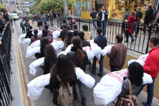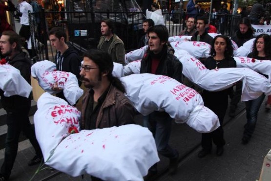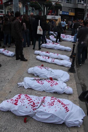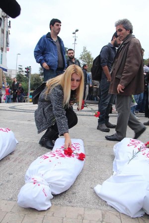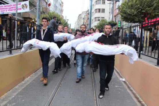Göstericiler, yanlarında getirdikleri ve üzerlerinde “Türk, Kürt, Müslüman, Hristiyan, Yahudi, Alevi, Sünni, Ezidi, Sadece ölen insanlık" yazılı temsili cenazeleri ellerine alarak yürüyüşe geçti. Boğa Heykeli önünde bir süre bekleyen eylemciler cenazelerin üzerine karanfil bıraktı.