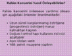 RAHİM AĞZI KANSERİ: "Kadın rahmi gövde ve rahim ağzı kısımlarından oluşur. Rahim ağzı rahmin doğum sırasında genişleyerek bebeğin çıkmasını sağlayan kısmıdır. Bu kısmı oluşturan hücrelerin anormal bölünmesi ve üremesi sonucunda rahim ağzı kanseri oluşur. Rahim ağzı kanseri, jinekolojik tümörler içinde sağlıklı kadınlarda yapılan düzenli tarama ile önlenebilen yegâne kanserdir. Rahim ağzı kanseri her yıl 500 binden fazla kadında görülüyor. Rahim ağzı kanseri tüm dünyada kadınlar arasında meme kanserinden sonra görülen en sık ikinci kanser türüdür. İstatistiklere göre 250 bin kadın her yıl bu hastalık nedeniyle hayatını kaybetmektedir. Ortalama oluşma yaşı 50'dir. Cinsel ilişki sonrası kanama görülmesi ilk işaret olabilir. Adet düzensizlikleri, kötü kokulu akıntı, karın alt bölge ağrıları yapabilir. Kansere dönüşmeden erken dönemde yakalanması pap-smear testi ile mümkündür. Bu yüzden, bütün kadınlara yılda bir defa smear testi önerilmektedir. Kanser öncülü bu hastalıkların cerrahi tedavileri tüm dünyada ve ülkemizde bilinmekte ve uygulanmaktadır. Ayrıca son yıllarda HPV(Human Papilloma Virüs)`nin yüksek riskli bazı tiplerinin rahimağzı kanserinin ve onun öncül hastalıklarının hemen hepsinde ana neden olduğu, virüsün hücrelerde kansere dönüşümü başlattığı gösterilmiştir. Bu virüsün bulaşmasını önleyerek kanser ve diğer hastalıklardan korunmanın mümkün olabileceği ise son yıllarda öne çıkan bir konudur. HPV`nin kanser oluşturan yüksek riskli tiplerinden olduğu kadar cinsel siğillere yol açan HPV tiplerinden de korunmak önemlidir. Virüsün bulaşmasını kızamık, suçiçeği, grip gibi hastalıklarda olduğu gibi bağışıklık sistemi yoluyla, vücuda virüs girse bile onu savunma sistemimizle yok ederek önlemek, aşı ile mümkündür. HPV aşısı son on yılın en önemli toplum sağlığı ve kanserle mücadele çabalarının başında gelmektir