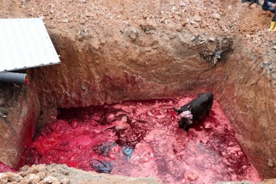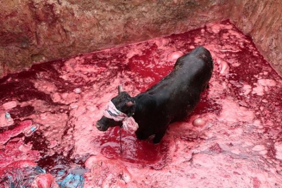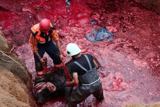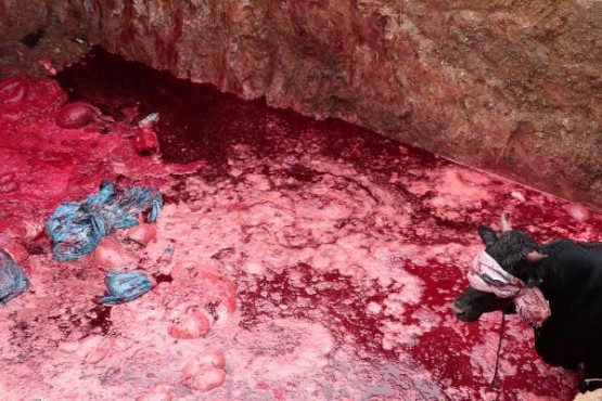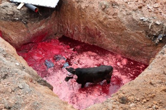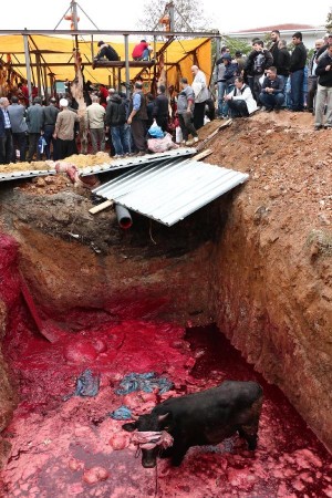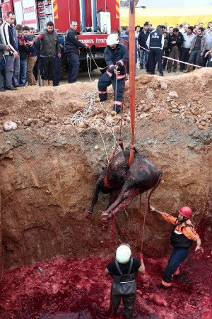 Yenisahra’da kurulan kurban satış yerinde, sahibi tarafından kesim yerine götürülen boğa, ipini kopardıktan sonra kaçmaya başladı. Kurban atıkları için açılan çukurun etrafındaki bariyerleri deviren boğa, 3 metrelik çukura düştü. Gözleri bağlı olaark kan ve kurban atıkları dolu çukura düşen boğayı çıkarmak için olay yerine itfaiye çağrıldı.