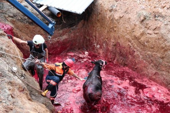 eterinerin uyuşturucu iğne atmasının ardından tekrar çukura giren itfaiye eri, boğanın tam olarak uyuşmaması yüzünden, ikinci kez yukarı çıkmak zorunda kaldı. İkinci kez atılan iğnenin ardından boğa uyuşarak kanın içine yığıldı. Bunun üzerine iki itfaiye eri tekrar çukura inerek boğanın boynuzlarına ve karnına ip bağladı. Yaklaşık iki saat süren çalışmalar sonunda boğa vinç yardımıyla yukarı çekildi.