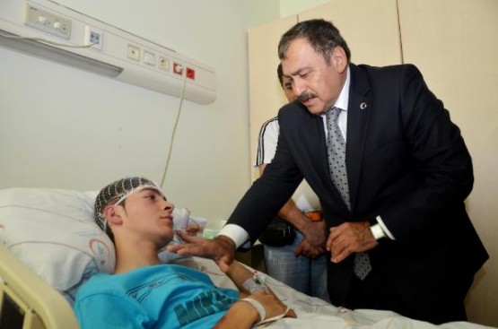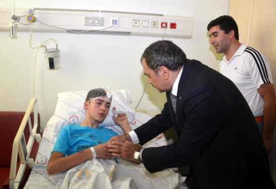 ORMAN VE SU ISLERI BAKANI VEYSEL EROGLU, ISPARTA'DAKI 13 BERBER VE KUAFORUN YASAMINI YITIRDIGI OTOBUS KAZASINDA YARALANAN VE ANTALYA EGITIM VE ARASTIRMA HASTANESI'NDE TEDAVIYE ALINAN ISMAIL OZEN'I ZIYARET ETTI.