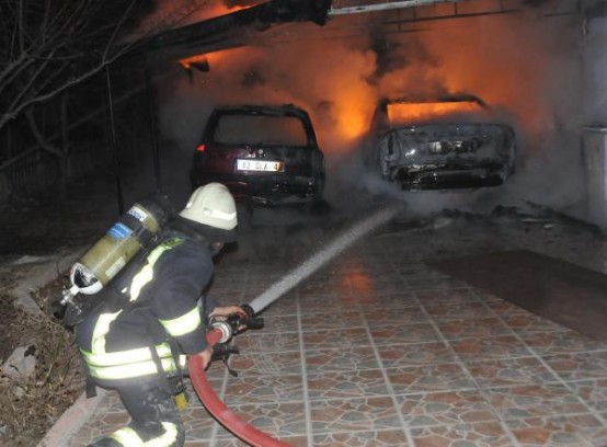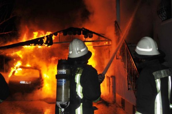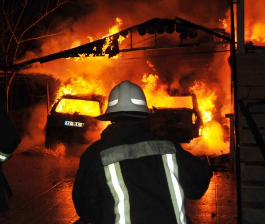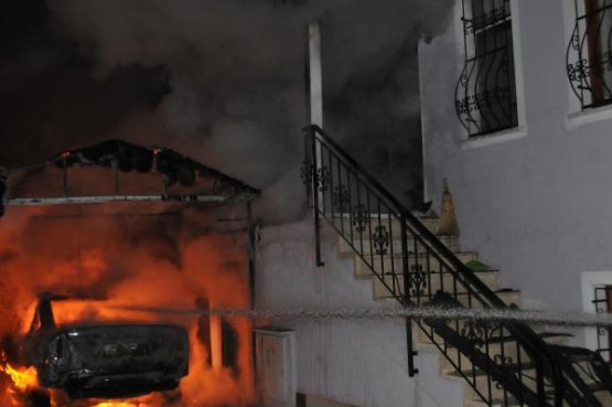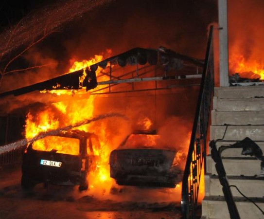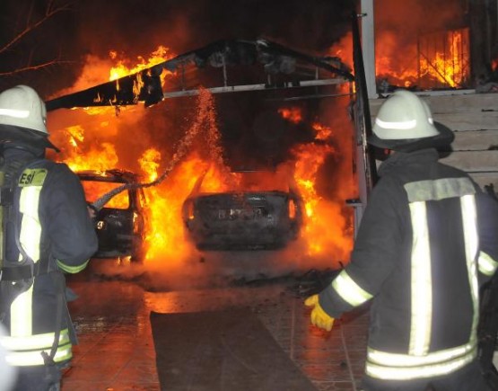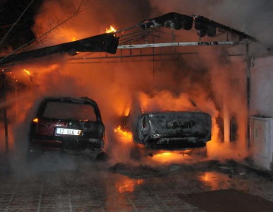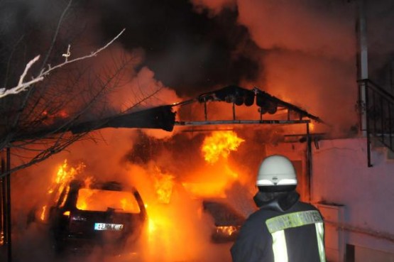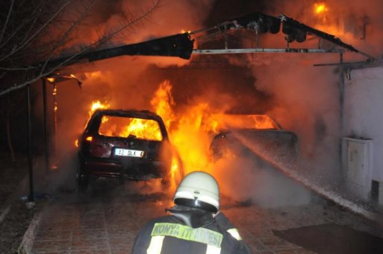 KONYA'da bahçedeki mangalda söndürülmeden bırakılan ateşin, yanında park halindeki iki otomobile sıçraması sonucu alev topuna dönen araçlarda patlama meydana geldi. Alevlerin binaya da sıçraması üzerinde evde mahsur kalan aynı aileden 3'ü çocuk 5 kişi 2'nci kattaki evlerinden komşularının pencereye uzattığı merdiven sayesinde kurtuldu. Alevler itfaiye ekiplerini müdahalesiyle söndürüldü.