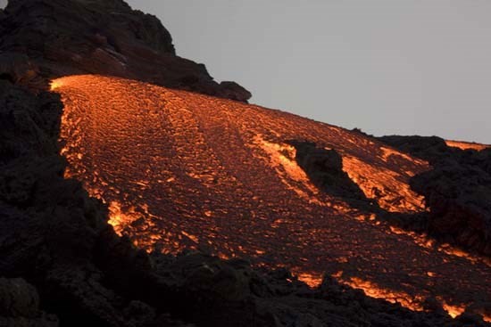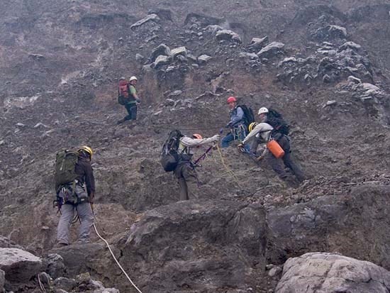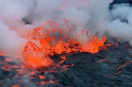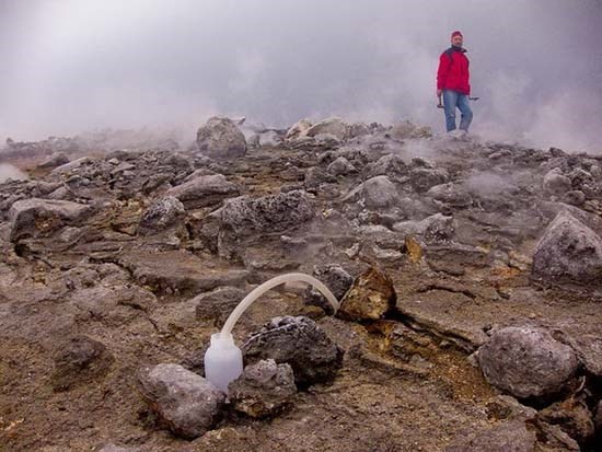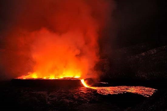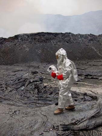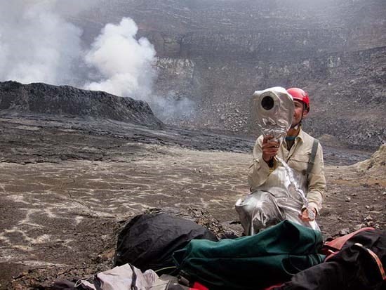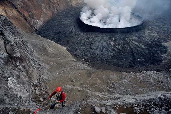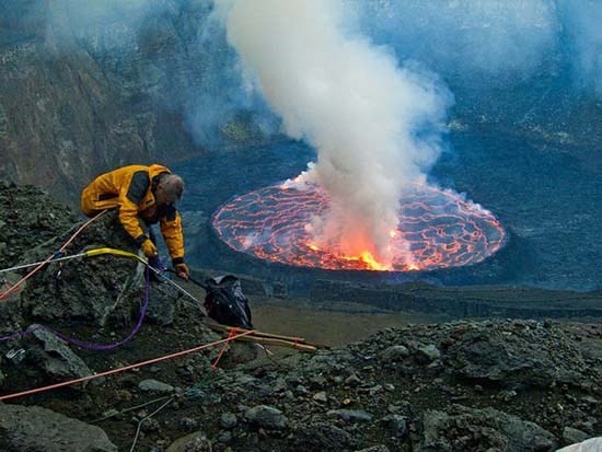 Bilim adamları ve korkusuz kaşif bir ekip Afrika'nın Büyük Göller bölgesinde kalbinde, Nyiragongo Crateri derinliklerinde kaynamakta olan lav gölünün kıyısına kadar çıktı.