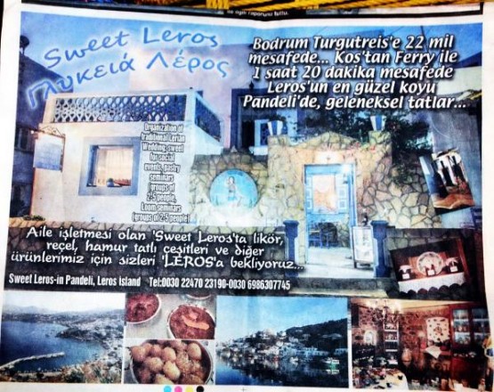 Muğla’nın Bodrum İçesi’ne sadece 18 mil uzaklıktaki Yunanistan’ın Leros Adası’nda faaliyet gösteren ve mönüsünde Ege’nin yöresel tatlılarına da yer veren tatlı evi 'Sweet Leros', tam 116 yıldır, adaya giden Türkler’in uğrak yeri olmayı sürdürüyor.