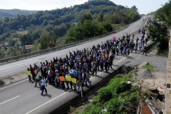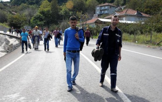 Bazı madenciler, çizme ve ayakkabılarını çıkarıp çoraplarıyla asfaltta yürüdü. Yorulan madenciler, zaman zaman asfalta ve yol kenarına oturarak dinlendi. Genel Maden İşçileri Sendikasının su dağıttığı işçilerin yürüyüşü devam ederken, aralarında madencilerin de bulunduğu bir grup da Zonguldak'ta Madenci Anıtı önünde toplandı.