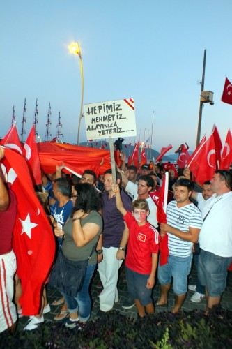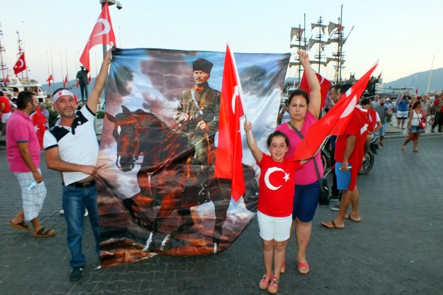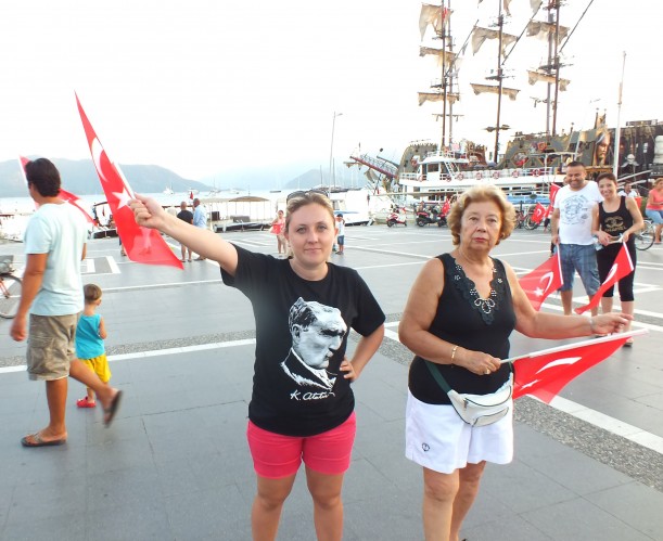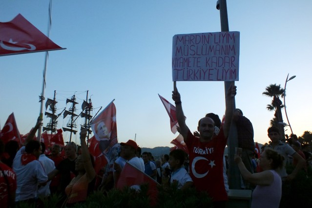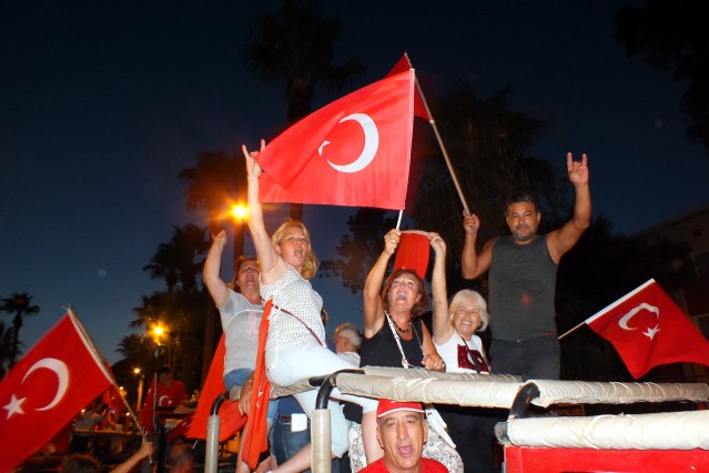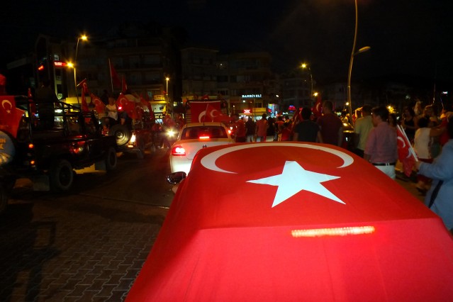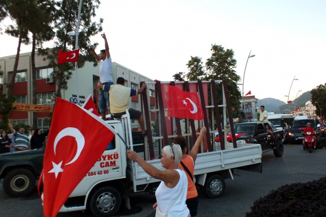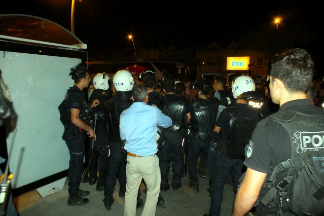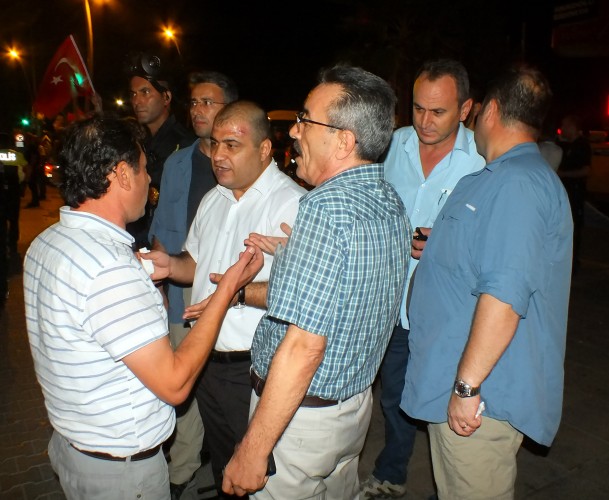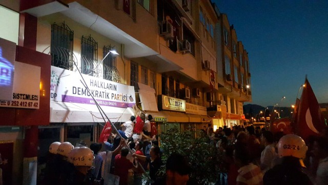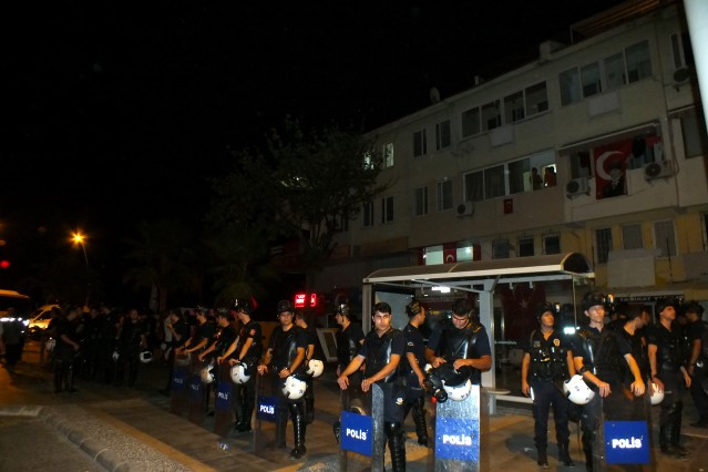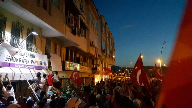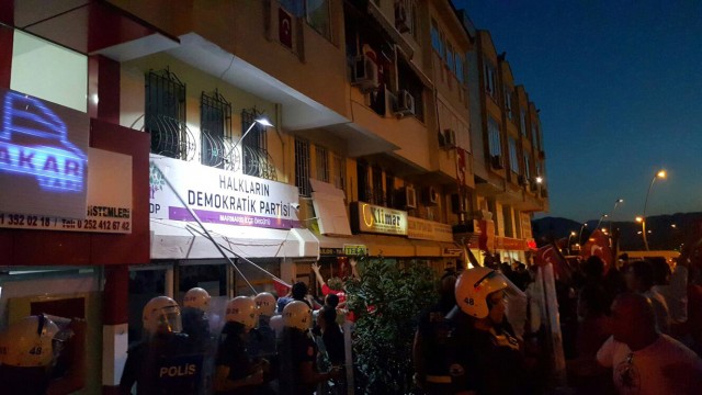 MUĞLA'nın Marmaris İlçesi'nde, sosyal paylaşım sitesi üzerinden haberleşen bir grup, terör saldırılarına tepki için sokaklara döküldü. Protestolar sırasında HDP İlçe binası tabelasına zarar verilirken, binaya Türk Bayrağı asıldı. Olaylar sırasında Muğla Emniyet Müdürü Hakan Çetinkaya atılan taş sonucu başından yaralanırken, 17 kişi gözaltına alındı.