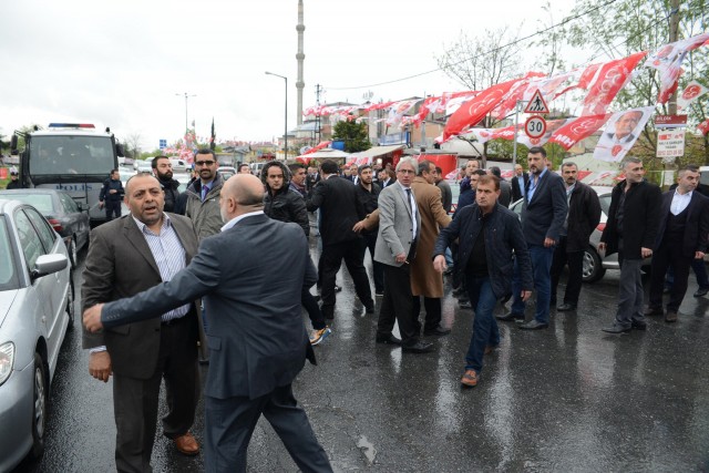 Seçim bürosu yakınındaki bayrak ve flamaları kesmek isteyen 5 kişi ile partililer arasında kavga çıktı. Kavga sırasında partililerden 2 kişi darp sonucu hafif yaralandı.