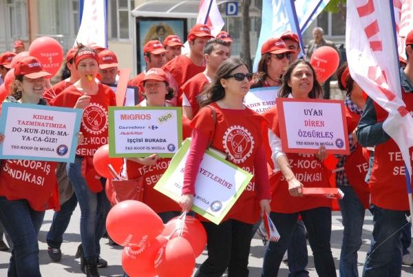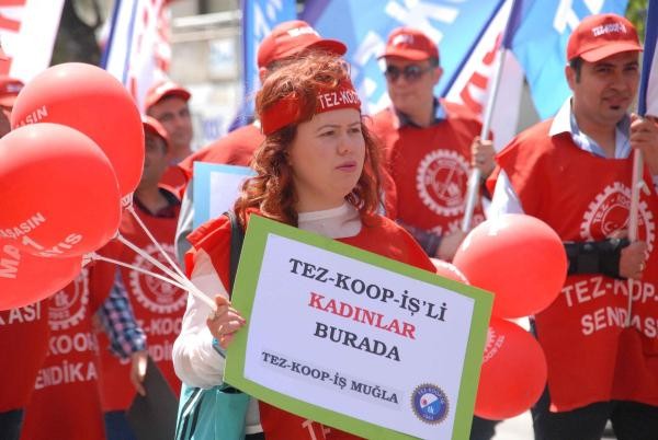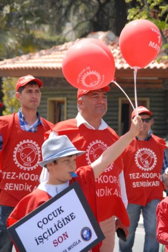 MUĞLA'da, 13 ilçeden yaklaşık 10 bin kişinin katıldığı 1 Mayıs İşçi Bayramı kutlamalarında 'Çocuk İşçiliğine Son' dövizi taşıyarak yürüyen minikler büyük ilgi gördü.