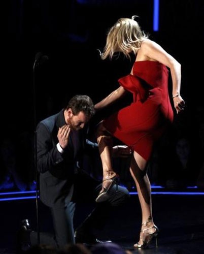 MTV Sinema Ödülleri gecesinde en iyi dövüş ödülünü kazananı açıklamak üzere sahneye çıkan Charlize Theron ve Michael Fassbinder "birbirlerine girdi".