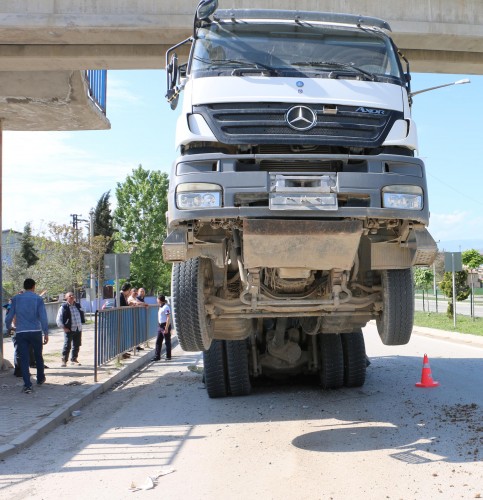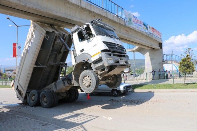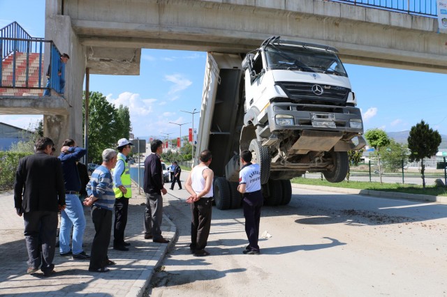 Samsun Vezirköprü'de damperli araç üst geçide takılıp şaha kalktı!