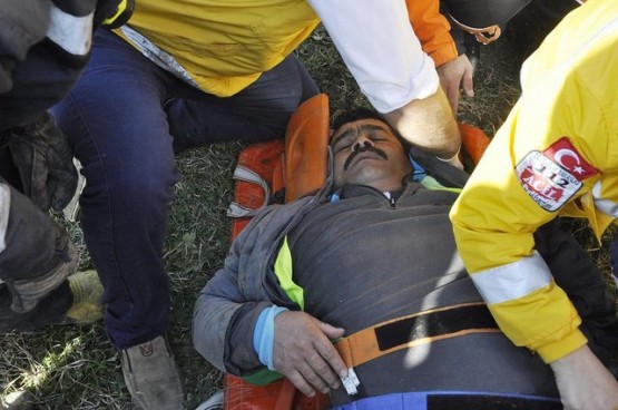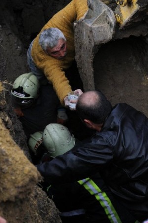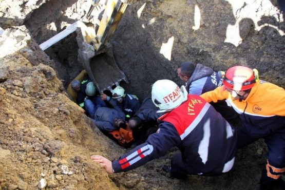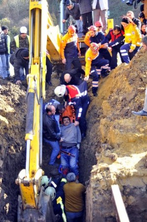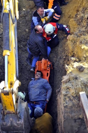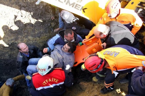 Diz altından toprağa gömülen işçi 45 dakika süren çalışma sonucu yaralı olarak topraktan çıkarıldı.
