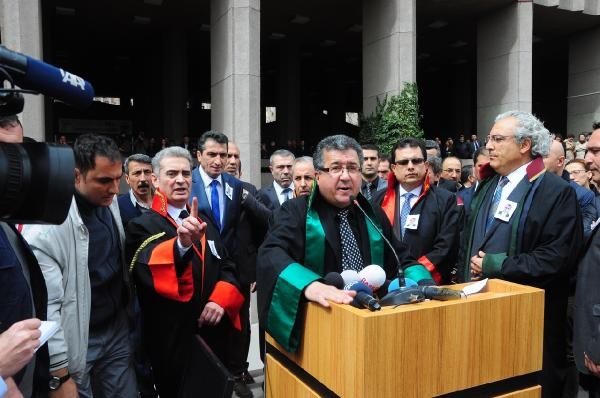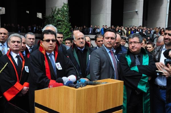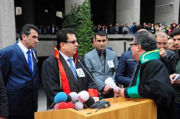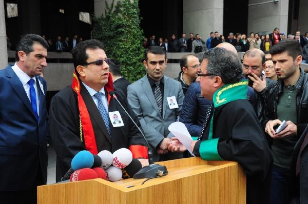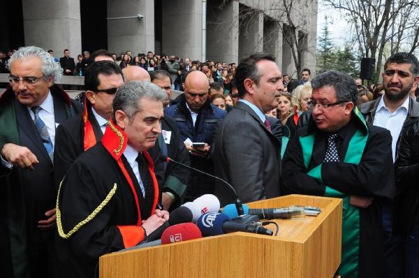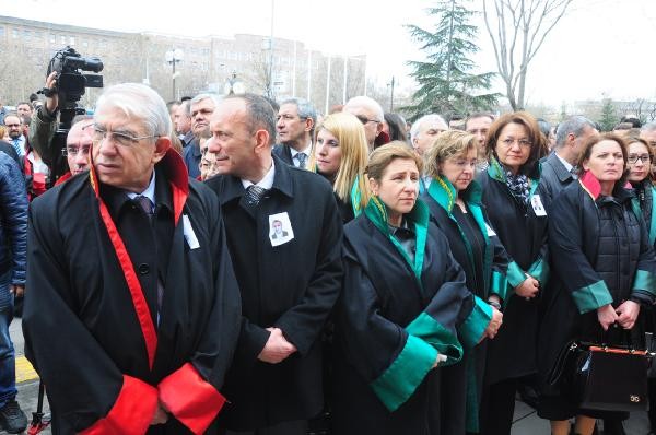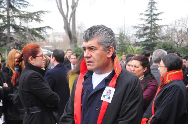 İSTANBUL Cumhuriyet Savcısı Mehmet Selim Kiraz'ın Çağlayan'daki İstanbul Adalet Sarayı'nın 6'ncı katındaki odasında şehit edilmesi nedeniyle Ankara Adliyesi önünde anma töreni düzenlendi. Hakim, savcı ve avukatların katıldığı törende konuşturulmak istenmediğini iddia eden Yargıçlar Sendikası Başkanı Mustafa Karadağ kürsüye çıktı. Bu sırada görevliler kürsü mikrofonunu kapattı. Bunun üzerine kısa süreli gerginlik yaşandı.
