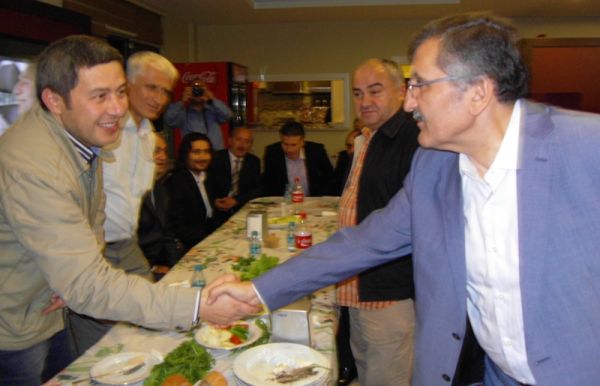 Sosyal Güvenlik Kurumu Başkan Yardımcısı Mustafa Kuruca yemeğe katılan Zeytinburnu Belediye Başkanı Murat Aydın'ı karşılarken...
