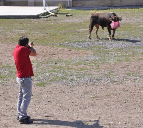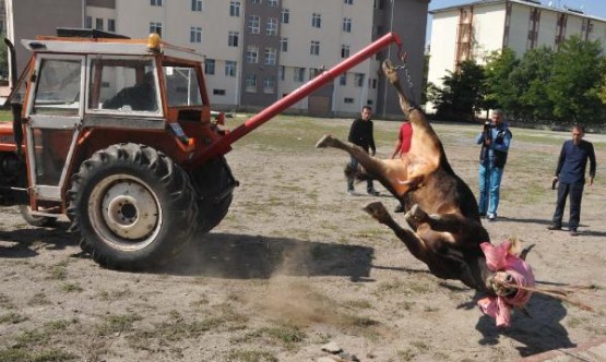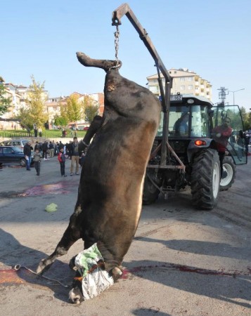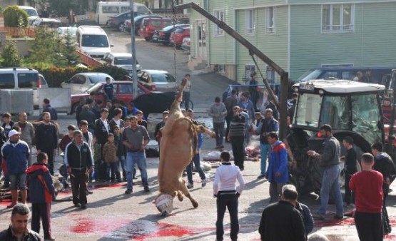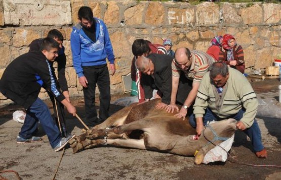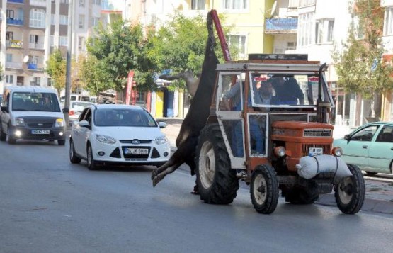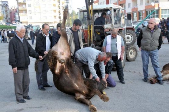 Okul bahçesinde kesilen boğa, getirilen bir traktörün vincine takılarak , yaklaşık bir kilometre uzaklıkta olan kaçtığı yere götürüldü ve burada yüzülüp eti sahiplerince paylaşıldı.