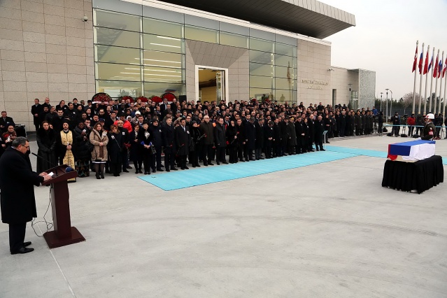 Türkeş, "Bugün çok zor bir görev için toplanmış bulunuyoruz. Değerli bir dostumuzu yitirdik acımız büyüktür. Büyükelçi Andrey Karlov topraklarımıza ayak bastığı andan itibaren ülkelerimiz arasındaki dostluğu güçlendirmek için çalıştı. ilişkileri her alanda daha ileri seviyelere taşıma arayışı içinde oldu. Görevi boyunca Büyükelçisi olduğu büyük ülkeyi ve onurlu halkını en iyi şekilde temsil etti.