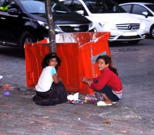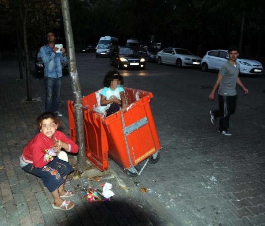 Bahçelievler’de arife akşamı çekilen bu fotoğrafta Suriyeli iki çocuk, bir çöp konteynerinde buldukları okul malzemeleri ve oyuncaklarla oynuyorlar. Fotoğraf çekildiğini görünce biri kaçıyor, diğeri ise utanarak yüzünü saklıyor.