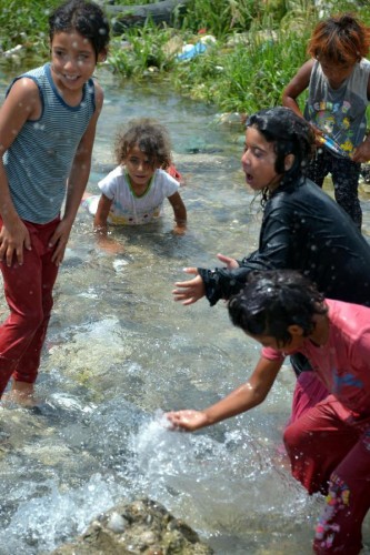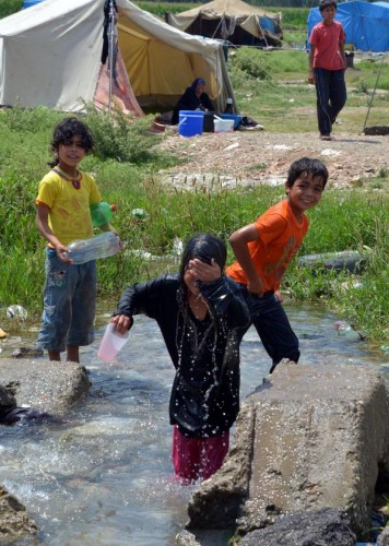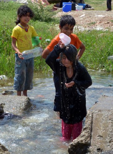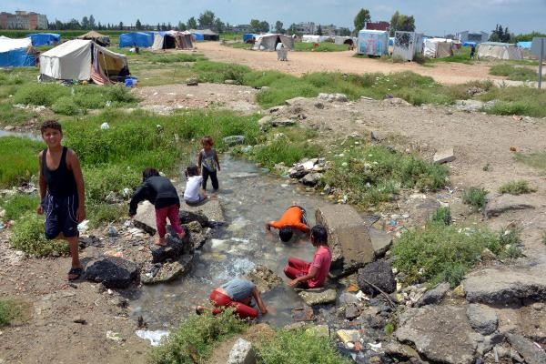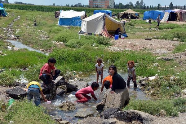 ÜLKELERİNDE iç savaştan kaçıp, geldikleri Adana'da derme- çatma çadırlarda yaşam mücadelesi veren Suriyeli mültecilerin çocukları, sıcak havada serinlemek için su birikintilerine giriyor.