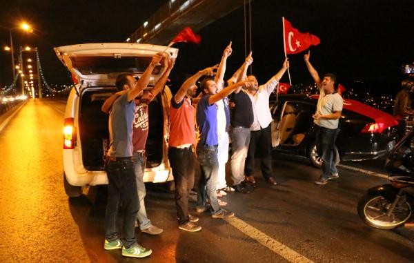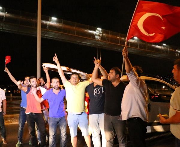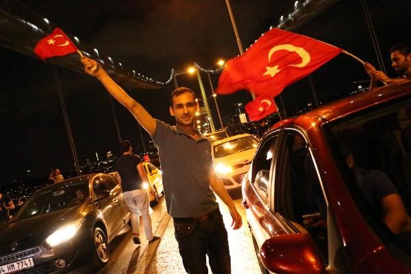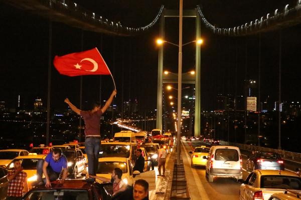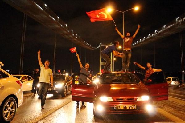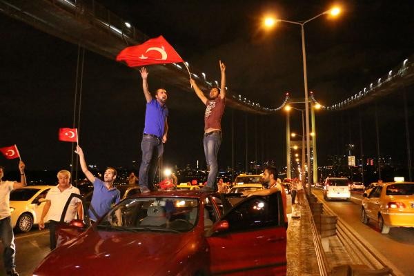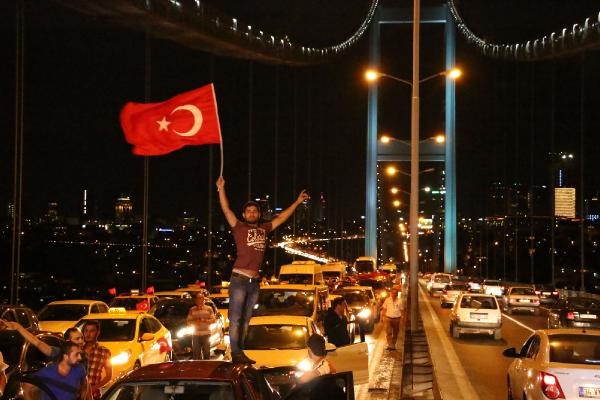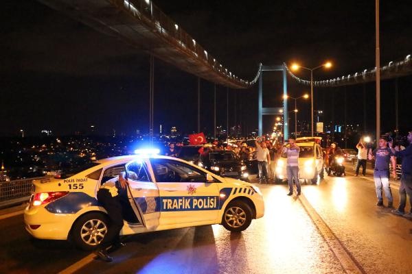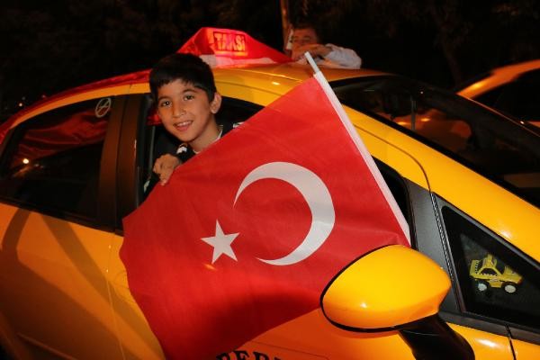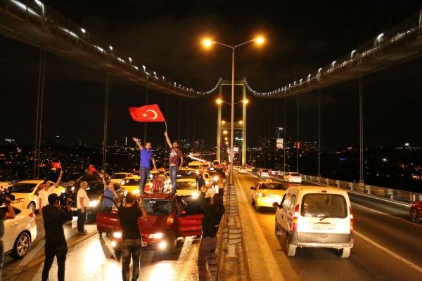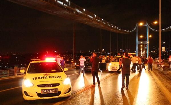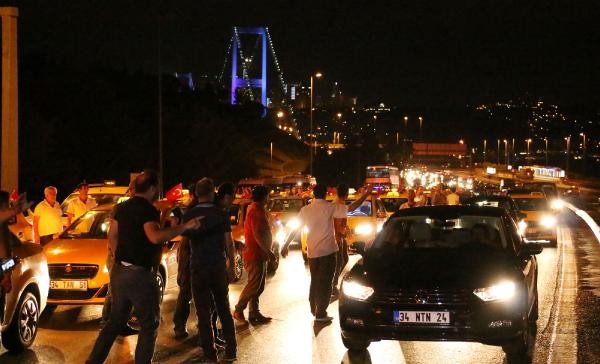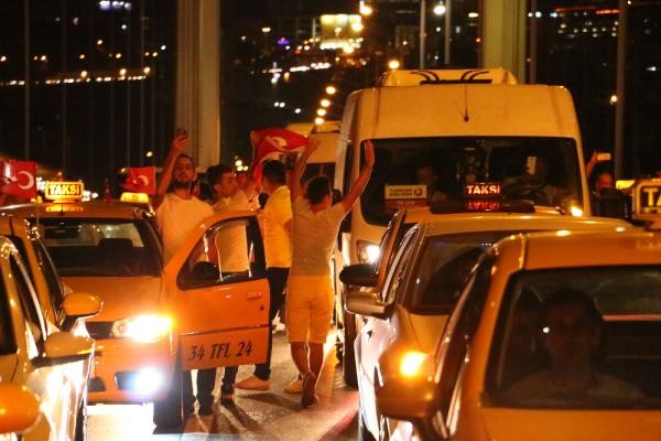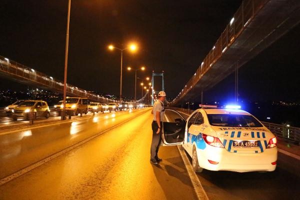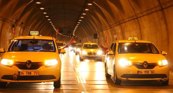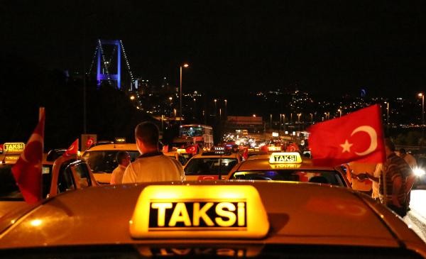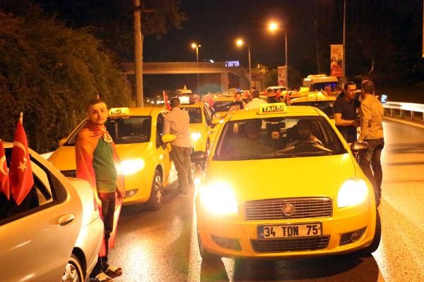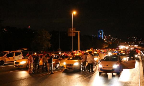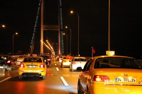 TERÖR olaylarını protesto etmek için toplanan taksi şoförleri, konvoy oluşturarak Boğaz Köprüsü üzerinde kontak kapattı. Köprü üzerinde Türk bayrağı açıp korna çalan taksiciler, polisin gelmesiyle köprüden ayrıldı. Son günlerde Türkiye'de yaşanan terör olayları ve bu saldırılarda çok sayıda asker ve polisin şehit olması üzerine, başta Birleşik Taksi Şoförleri Derneği'ne üye taksiciler olmak üzere İstanbul'da toplanan çok sayıda taksi şoförü terör saldırılarını protesto etti. Araçlarını Türk bayrakları ile donatan taksiciler, Beyoğlu'nda toplanıp, konvoy eşliğinde korna çalarak Boğaz Köprüsü'ne doğru harekete geçti.