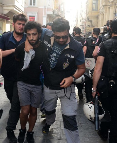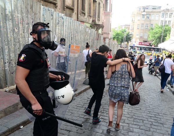 TAKSİM'de yürüyüş yapmak isteyen LGBTİ üyelerine polis müdahale etti.Beyoğlu İmam Adnan Sokak'ta toplanan LGBTİ üyeleri, düdük çalıp ellerindeki flama ve pankartlarla Taksim Meydanı'na yürümek istedi.