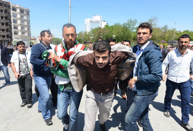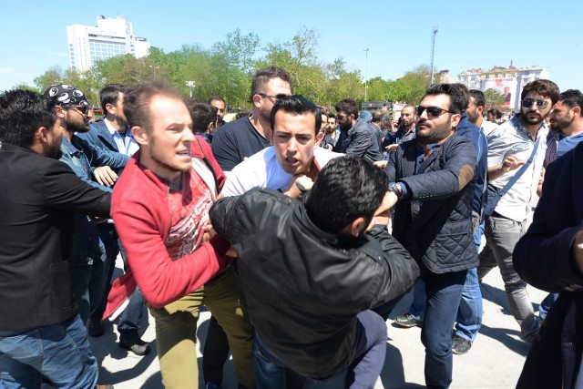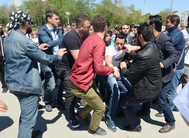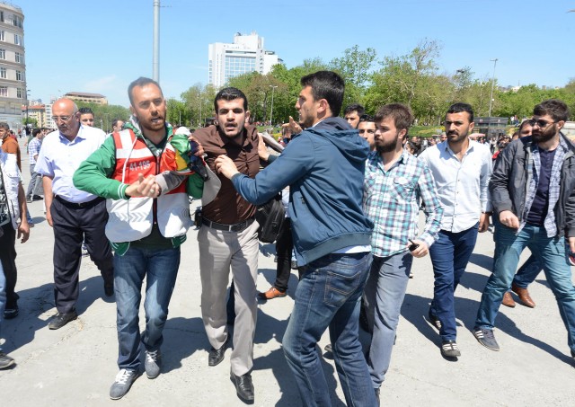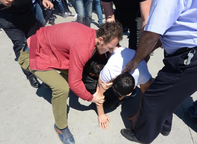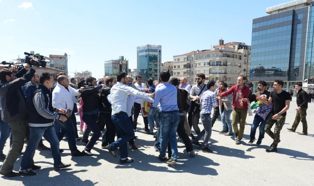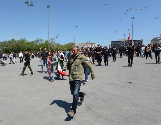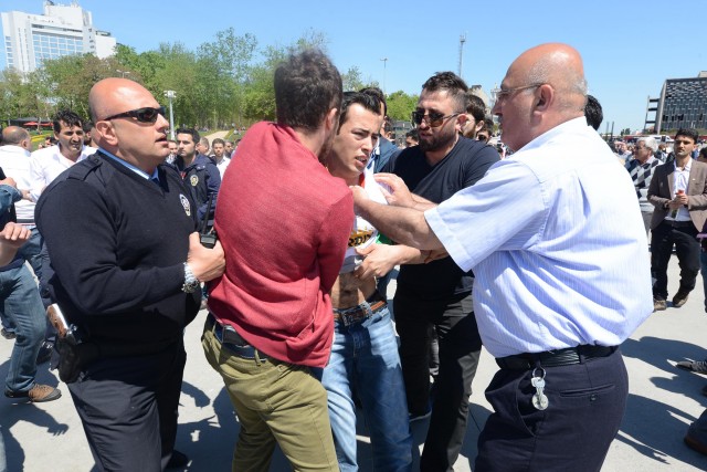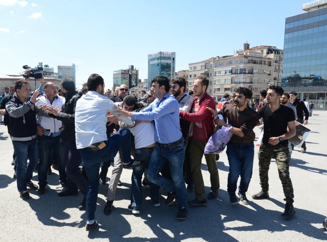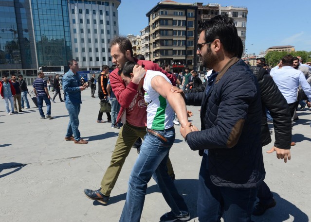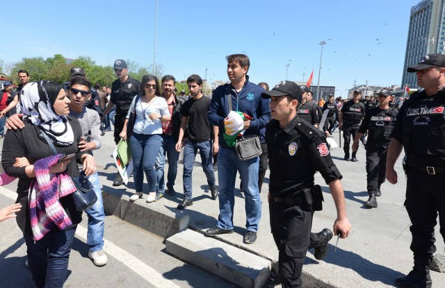 Polisler grubu ellerindeki bayrakları almaya çalıştı. Bir süre sonra gelen takviye ekiplerin yardımıyla grup meydandan uzaklaştırıldı. Gruptan bazılarının direnmesi üzerine polis 5 kişiyi gözaltına aldı. Bu sırada küçük çaplı arbede yaşandı. Aralarından kadın ve çocukların da bulunduğu grup, çevik kuvvet ekiplerinin gelmesiyle, Tarlabaşı Caddesi yönünde dağıldı. Gözaltına alınan 5 kişi, polis merkezine götürüldü.