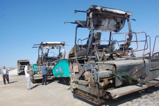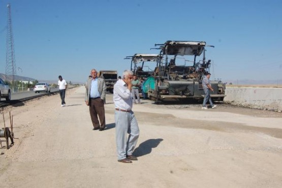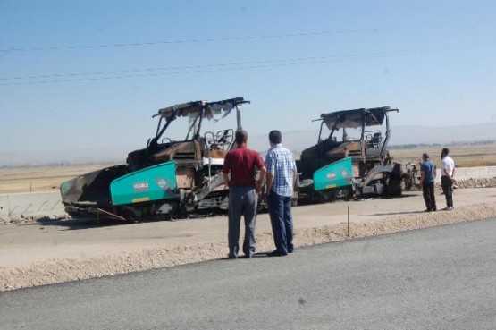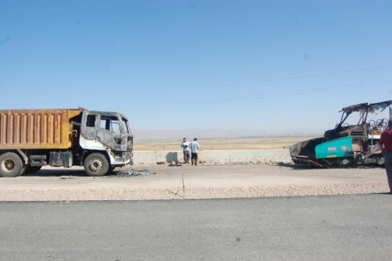 PKK'lı teröristler okulları yakıp yıktıktan şimdi de Muş-Diyarbakır karayolunda asfalt çalışmasında kullanılan 1 kamyon ve 2 asfalt aracı yaktı.