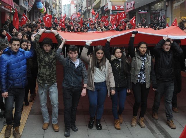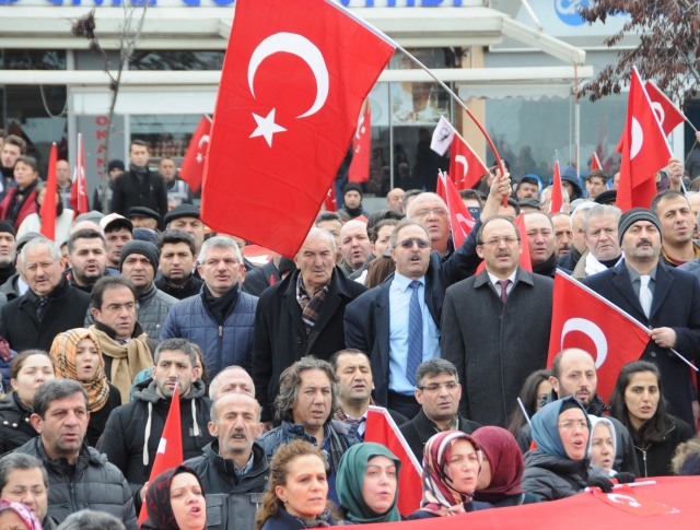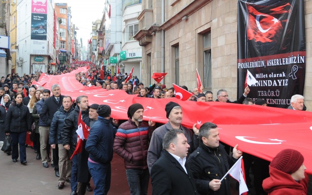 Türk bayraklarıyla terör örgütü aleyhine sloganlar atarak Atatürk Meydanı’na kadar yürüyen kalabalık, burada saygı duruşunda bulundu, İstiklal Marşı’nı okudu.