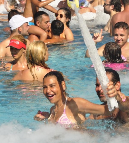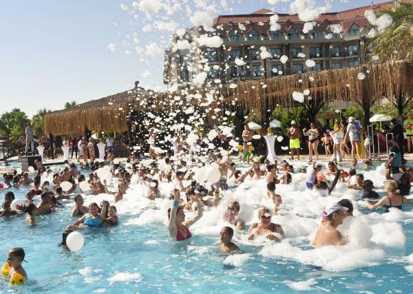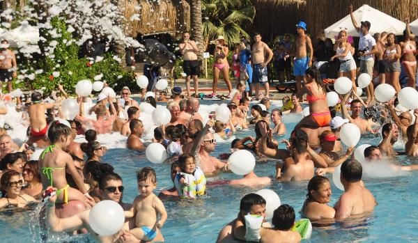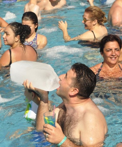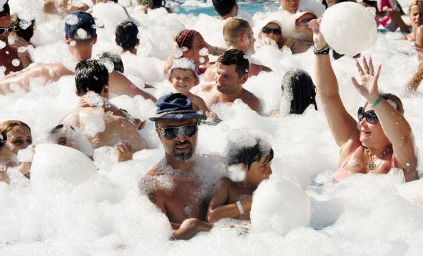 ANTALYA'nın Manavgat İlçesi'nde yerli ve yabancı tatilciler buzlu ve köpüklü havuz partisiyle bir yandan eğlenirken bir yandan da bunaltıcı sıcağın etkisinden kurtulmaya çalıştı.