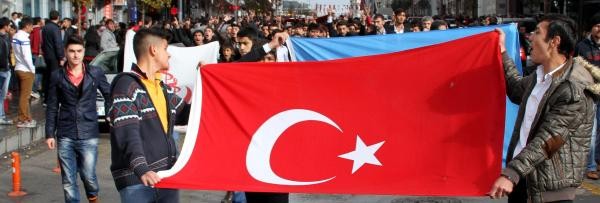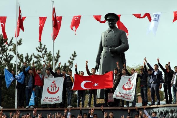Hakkari'nin Yüksekova ilçesinde dün PKK'lı teröristlerin uzman çavuş Ramazan Gül ile erler Yunus Yılmaz ve Ramazan Köse'nin şehit edilmesine tepki gösteren Ülkü Ocakları ve Alperen Ocakları üyeleri bugün öğle saatlerinde merkez Yakutiye ilçesindeki Cumhuriyet Caddesi'nde toplandı.