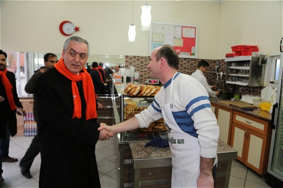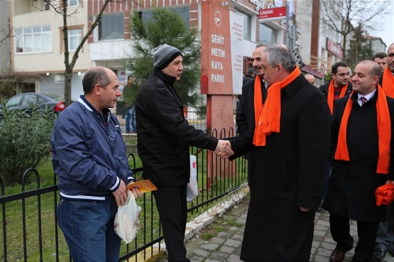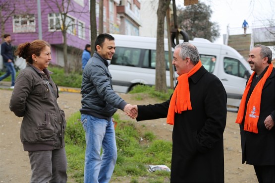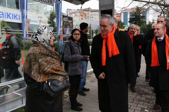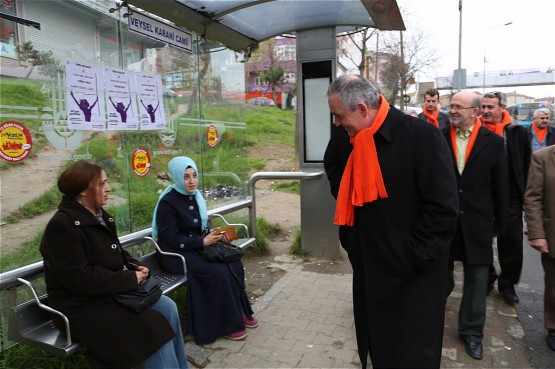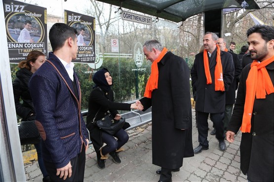 Remzi Aydın, dükkanını yeni açan esnaflarla sohbet etti ardından evlerinden çıkıp otobüs duraklarında işe gitmek için bekleyen Eyüplü vatandaşlarla selamlaştı.