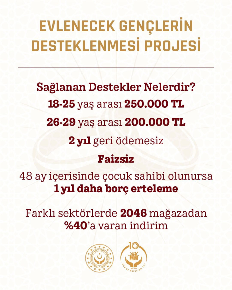 Projenin, aile kurma yolunda ilk adımı atan gençlerin ekonomik yükünü hafifletmeyi amaçladığı ifade edilirken, desteklerin evlilik sürecini daha kolay ve erişilebilir hale getirmeyi hedeflediği vurgulandı.