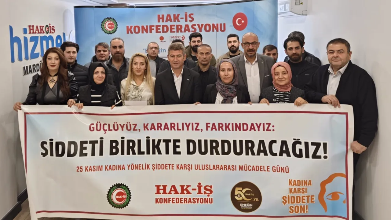 Çalışma hayatında kadına yönelik şiddetin önlenmesi için HAK-İŞ'in 15 maddelik acil eylem çağrısını da açıklayan Hak-İş Mardin İl Başkanı ve Hizmet-İş Şube Başkanı Aziz Adıbelli, talepler arasında sendikal örgütlenmenin önündeki engellerin kaldırılması, ILO C190 Sözleşmesi'nin onaylanması, işyerlerinde 'Şiddete Sıfır Tolerans Politikası' uygulanması, eşit işe eşit ücret denetiminin güçlendirilmesi, dijital şiddetle mücadele ve mağdurlara hızlı hukuki ve psikolojik destek sağlanması konularının yer aldığını söyoledi.