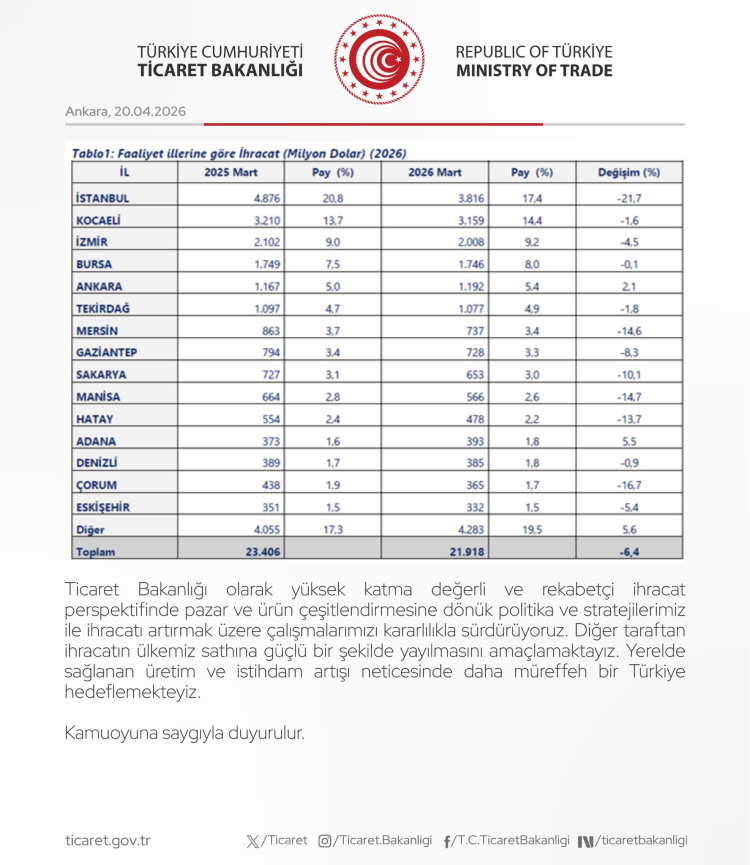 Mart ayı verilerine göre ihracatta liderlik değişmedi. İstanbul 3 milyar 816 milyon dolarlık ihracatla ilk sırada yer alırken, Kocaeli 3 milyar 159 milyon dolarla ikinci, İzmir 2 milyar 8 milyon dolarla üçüncü oldu. Bursa 1 milyar 746 milyon dolarla dördüncü sıraya yerleşirken, Ankara 1 milyar 192 milyon dolarla beşinci sırada yer aldı.