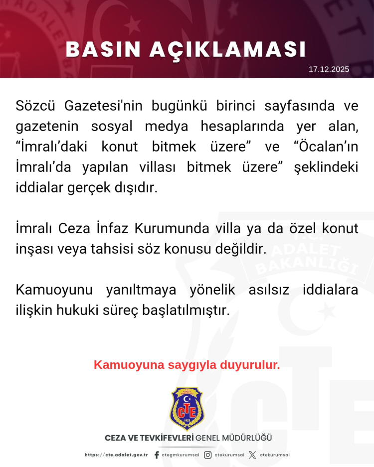 İmralı Ceza İnfaz Kurumu'na 'villa yapıldığı' yönündeki iddiaların sorulması üzerine Bakan Tunç, bu haberlerin asılsız olduğunu ifade etti. Tunç, 'Bu haberler doğru değil. İmralı'da bir bina yapımı ya da benzeri bir durum söz konusu değil' dedi.