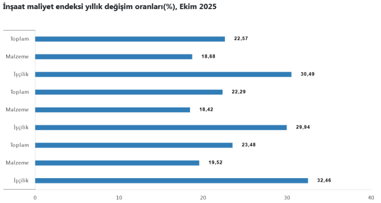 TÜİK'in açıkladığı Ekim 2025 verilerine göre inşaat maliyet endeksi yıllık bazda yüzde 22,57 yükselirken, aylık artış yüzde 0,98 oldu. İşçilik maliyetlerindeki yıllık artış yüzde 30'u aşarak dikkat çekti.