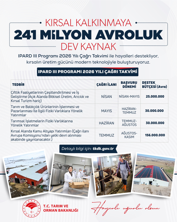 Tarım ve Orman Bakanlığı ile Avrupa Birliği tarafından finanse edilen IPARD III Programı kapsamında 2026 yılı çağrı takvimi yayımlandı. 241 milyon avroluk hibe desteğiyle kırsalda yaklaşık 400 milyon avroluk yatırımın hayata geçirilmesi hedefleniyor.