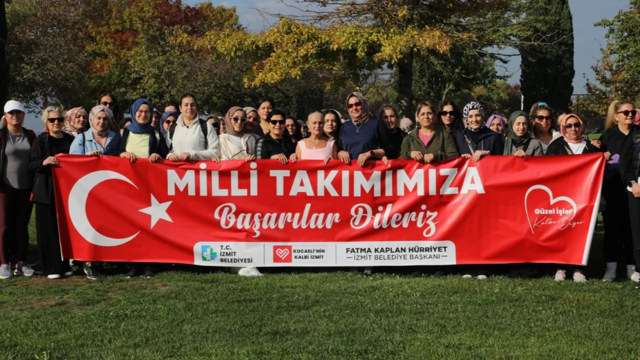 İzmit Belediyesinin düzenlediği sağlıklı yaşam yürüyüşü etkinliğinde, katılımcılar bu akşam kentimizde oynanacak Türkiye-Gürcistan maçında milli takıma başarı dilemek için destek pankartı açtı