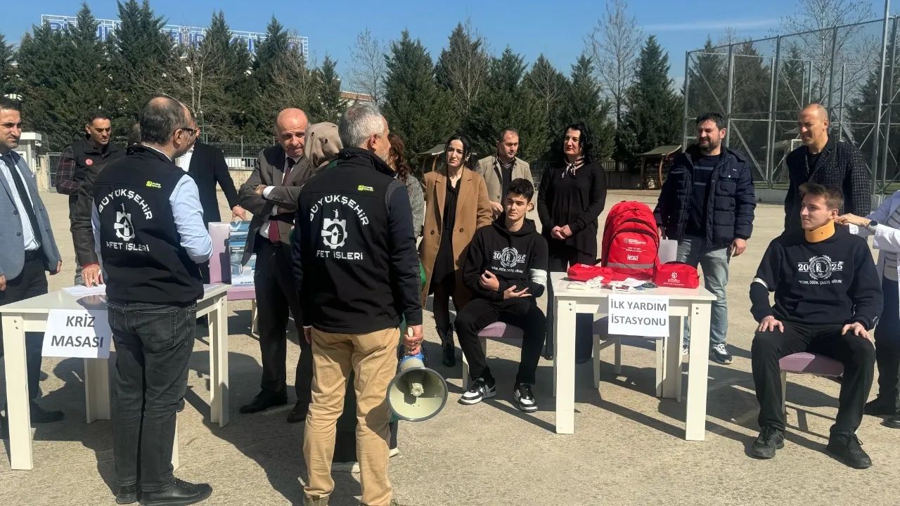 Düzenlenen etkinliklerde deprem tatbikatı uygulamalı olarak katılımcılar ile paylaşıldı. Tatbikat senaryosuna göre, deprem anında öğrenciler ve öğretmenler güvenli alanlarda “Çök-Kapan-Tutun” hareketini gerçekleştirdi. Depremin bitmesiyle birlikte tahliye süreci başlatılarak, öğrenciler sınıflarını güvenli ve düzenli bir şekilde boşalttı. Tatbikat sonucunda afet ve acil durum hazırlıklarının iyileştirmesi noktasında alınması gereken önlemler değerlendirildi.