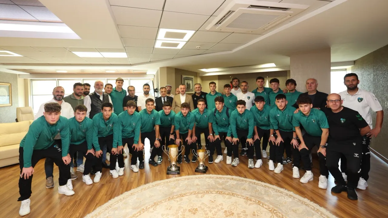 Kocaelispor’da ağabeylerinin izinden giderek Bölgesel Gelişim Ligi Türkiye Şampiyonu olan U19 Takımı, kupalarıyla birlikte Kocaeli Büyükşehir Belediye Başkanı Doç.Dr.Tahir Büyükakın’ı ziyaret etti.KOCAELİ (İGFA) - Trendyol 1.Lig’de şampiyon olarak Süper Lig hasretine son veren Kocaelispor’un gençleri de U19 Ligi’nde Türkiye Şampiyonu olarak ikinci bir sevinç yaşatmıştı.