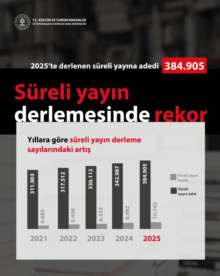 Kültür ve Turizm Bakanlığı, basılı ve elektronik yayınların derlenmesi çalışmalarında 2025 yılında önemli rekorlar kırıldığını açıkladı. Toplam 10 bin 742 başlık ve 384 bin 905 süreli yayın derlendi.