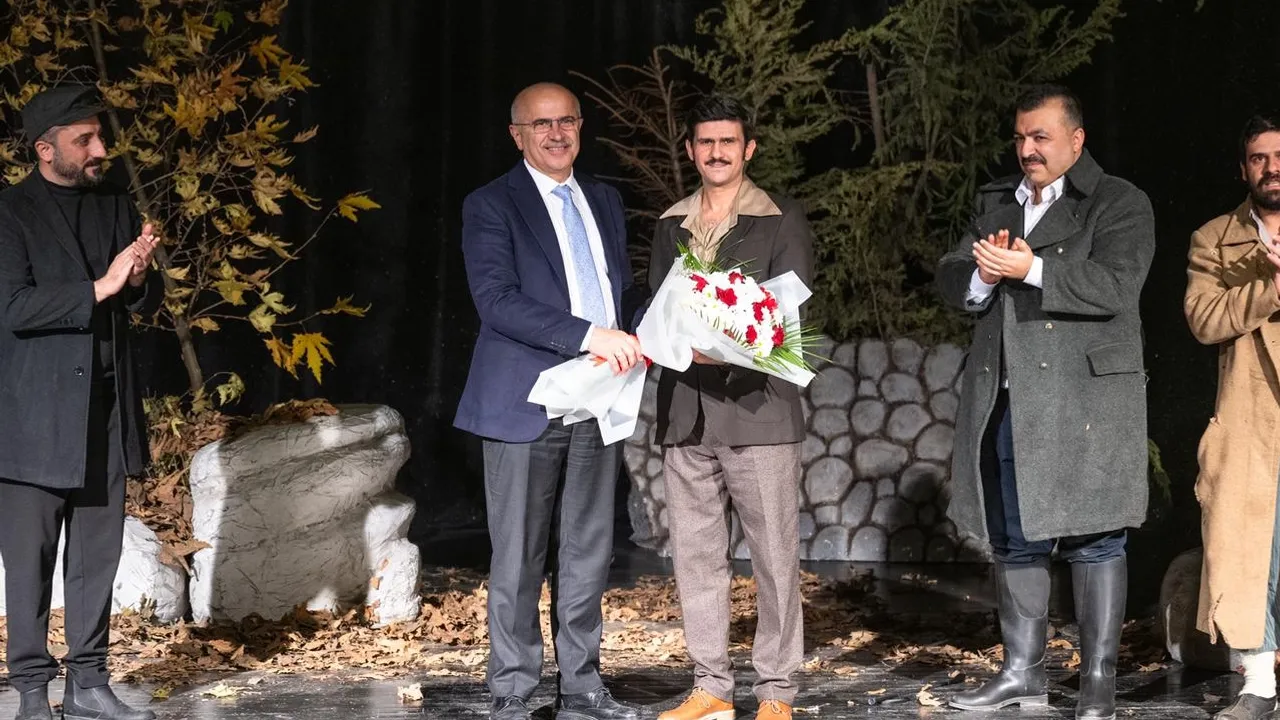 Tek perdelik dram oyununun sonunda Büyükşehir Belediye Başkanı Sami Er, oyuncuları tebrik ederek çiçek takdim etti.
