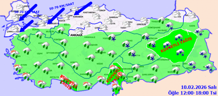 Türkiye genelinde çok bulutlu olacak hava raporuna göre; Ege, Akdeniz, İç Anadolu, Orta ve Doğu Karadeniz, Doğu ve Güneydoğu Anadolu ile Marmara'nın bazı kesimlerinde aralıklı yağış bekleniyor. Yağışlar genellikle yağmur ve sağanak şeklinde görülürken, iç ve doğu bölgelerin yüksek kesimlerinde karla karışık yağmur ve kar etkili olacak. Doğu Anadolu'nun doğusunda ise kar yağışı öne çıkıyor.