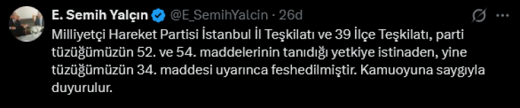 MHP Genel Başkan Yardımcısı ve İstanbul Milletvekili E. Semih Yalçın, MHP İstanbul İl Teşkilatı ve 39 ilçe teşkilatının parti tüzüğü gereği feshedildiğini duyurdu.