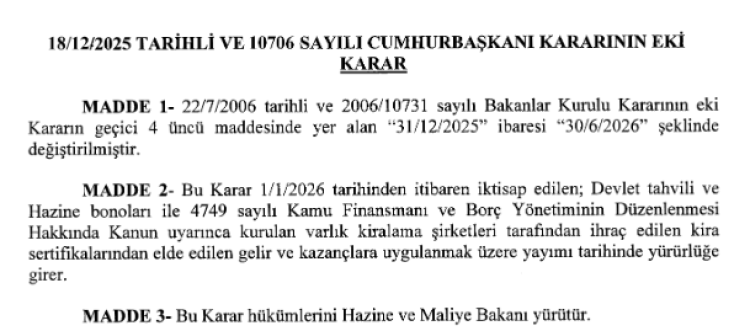 Söz konusu bu değişiklikle, özellikle Devlet tahvili, Hazine bonosu ve varlık kiralama şirketleri tarafından ihraç edilen kira sertifiklerinden elde edilen gelir ve kazançlara uygulanan mevcut tevkifat oranlarının geçerliliği 30 Haziran 2026 tarihine kadar uzatılmış oldu.