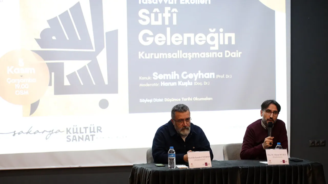 SAKARYA (İGFA) - Sakarya Büyükşehir Belediyesi Kasım etkinlikleri OSM'de 'Sûfî Geleneğin Kurumsallaşmasına Dair' söyleşide vatandaşlarla buluşan Prof. Dr. Semih Ceyhan, 'Tarikatlar miladi 8. yüzyılda ortaya çıkmaya başlamış, 10. yüzyılda Irak'ta kurumsal bir yapıya dönüşmüştür. Başlangıçta zühd ve tasavvuf anlayışını benimseyen zahitlerin oluşturduğu manevî çevreler zamanla 'tarikat' adını almıştır' ifadelerini kullandı.