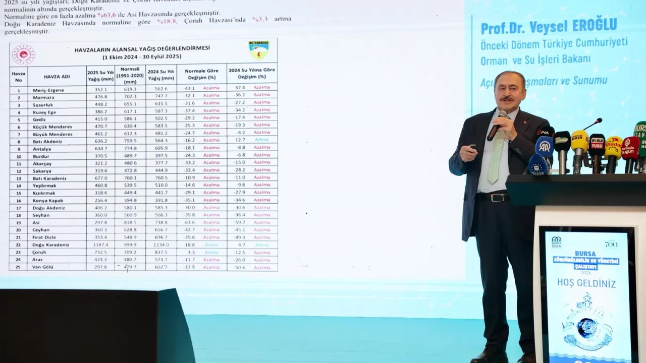 Bursa'yı çok sevdiğini ve şehir ile arasında gönül bağı olduğunu vurgulayan Orman ve Su İşleri eski Bakanı Veysel Eroğlu; 'Evet bir iklim değişikliği ile karşı karşıyayız. Ancak doğru planlama yapılırsa ne Bursa'da ne de Türkiye'de herhangi bir su sorunu yaşanmaz. Yeşil Bursa'daki mevcut su yatırımlarının yüzde 90'ı bizim hükümetlerimiz döneminde gerçekleştirilmiştir. Sayın Cumhurbaşkanımızın da Bursa'da projelerin aksamaması için özel talimatı var. Dağdibi, Kocayayla, Ağlaşan Kayacık, Gözede, Yalıçiftlik, Çınarcık, Altıntaş, Karıncalı, Nilüfer, Boğazköy, Çiçeközü, Gökçesu barajları bizim dönemimizde Bursa'ya kazandırıldı. Bakınız 23 yılda Bursa'ya; 25 adet baraj, 12 adet HES, 54 adet sulama tesisi, 4 adet içme suyu tesisi, 27 adet taşkın önleme tesisi ve 5 adet arazi toplulaştırma projesi olmak üzere toplamda 152 adet tesis kazandırdık. Bu tesislerin yatırım maliyeti ise yaklaşık 76 milyar TL. Ancak bu yatırımlara rağmen Bursa'nın yaşadığı sıkıntılar ortada. Yakın vadede bu sorunu aşmak için Çınarcık barajı devreye alınmalıdır. Çınarcık Barajı'ndan su alınıp arıtma tesislerine taşınmalı. Bu su da Bursa'ya verilmelidir. Böylece Bursa'nın su sorunu kalmaz' ifadelerini kullandı.