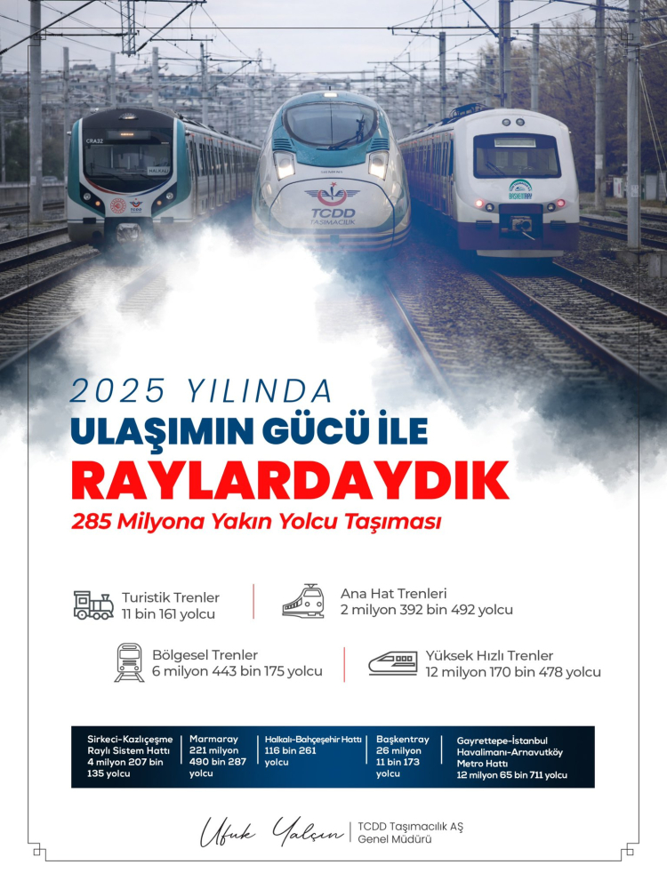 TCDD Taşımacılık AŞ Genel Müdürü Ufuk Yalçın, 2025 yılında ana hat, bölgesel, turistik ve yüksek hızlı trenlerle yaklaşık 285 milyon yolcunun taşındığını açıkladı.