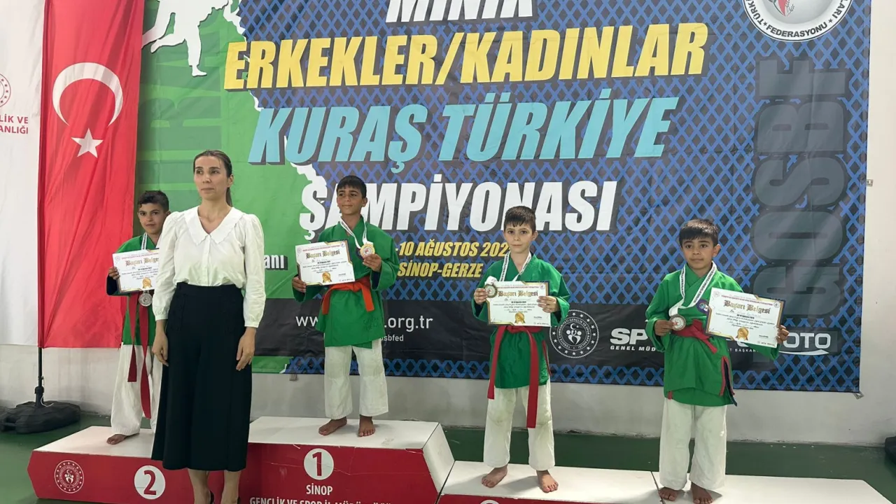 TRABZON (İGFA) - Trabzon Büyükşehir Belediyespor Kulübü sporcuları, başarıları ile gururlandırmaya devam ediyor. 8-10 Ağustos 2025 tarihleri arasında Sinop’ta düzenlenen Minikler Türkiye Kuraş Şampiyonası’na bireysel olarak katılan sporculardan 40 kiloda Yüsra İnan ve 52 kiloda Aylin Şimşek şampiyon oldu. 24 kiloda Hafsa Pehlivan ve 48 kiloda Damla Hamzaoğlu ikinci olurken Kürşad Değermenci 26 kiloda üçüncü oldu.