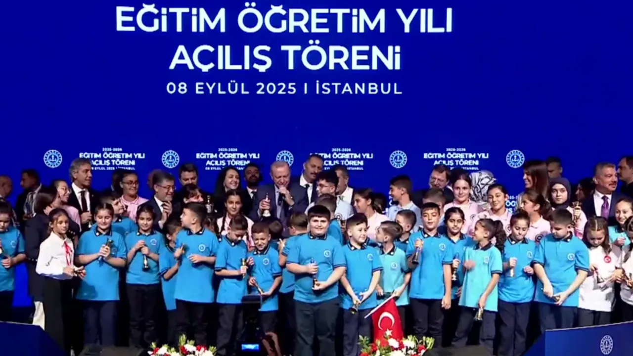 2025- 2026 eğitim öğretim yılı açılış töreni Cumhurbaşkanı Recep Tayyip Erdoğan'ın katılımıyla İstanbul'da Prof. Dr. Mümtaz Turhan Sosyal Bilimler Lisesi'nde gerçekleştirildi. Ders zillerini öğrencilerle birlikte çalan Cumhurbaşkanı Erdoğan, yeni eğitim öğretim yılının hayırlı uğurlu olmasını diledi..İSTANBUL (İGFA) - Cumhurbaşkanı Recep Tayyip Erdoğan, Mümtaz Turhan Sosyal Bilimler Lisesi'nde 2025-2026 Eğitim Öğretim Yılı Açılış Töreni'nde konuştu.