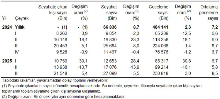 TÜİK verilerine göre 2025'in Temmuz-Eylül döneminde 21,5 milyon kişi yurt içinde seyahate çıktı. Yerli turistlerin toplam harcaması 276,1 milyar TL'ye ulaşırken, seyahatlerin yarıya yakını yakınları ziyaret amacıyla yapıldı.